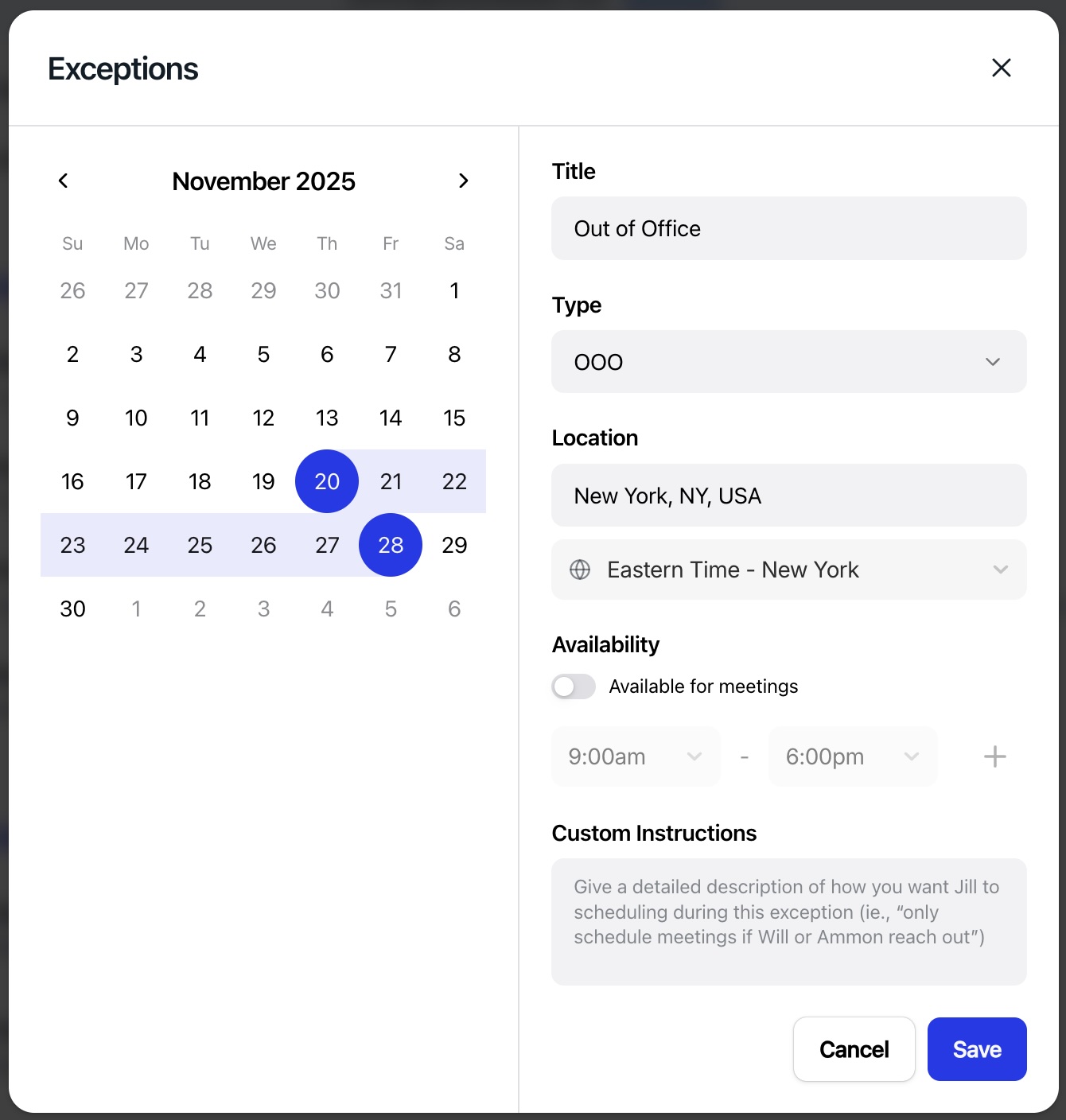 Exceptions let you override your regular availability for specific date ranges. They're temporary rules that take precedence over your standard working hours, preferred hours, and other scheduling preferences. Heading to LA for a client meeting? Create an exception that shifts your availability to Pacific Time. Taking Friday off? Mark yourself as out of office and Workmate won't book anything.